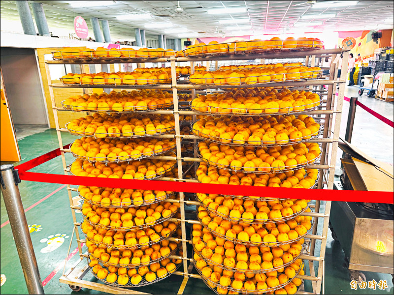 嘉義縣番路鄉柿子年產量4000公噸,但加工量能不足,目前僅能處理總產量的3%,圖為番路鄉農會製作柿餅。(記者蔡宗勳攝)