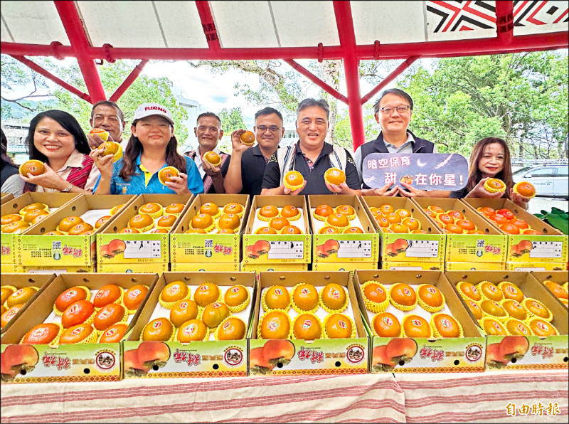 復興區拉拉山甜柿豐收,區長蘇佐璽(右三)邀民眾參加拉拉山一生一柿暗空慶典活動。(記者李容萍攝)