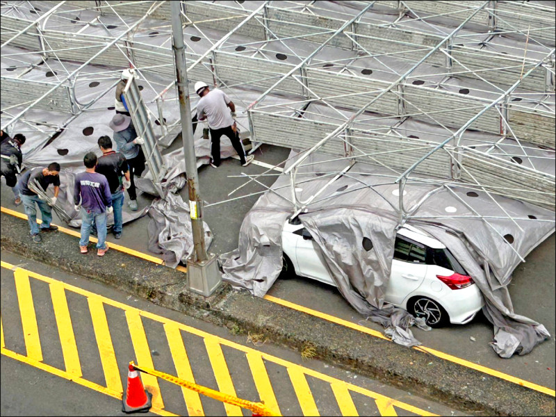 台中中央市場鷹架被吹倒 壓6車1傷