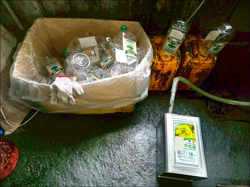 檢調警在倉庫查扣低價芥花油。 (嘉義市調查站提供)
