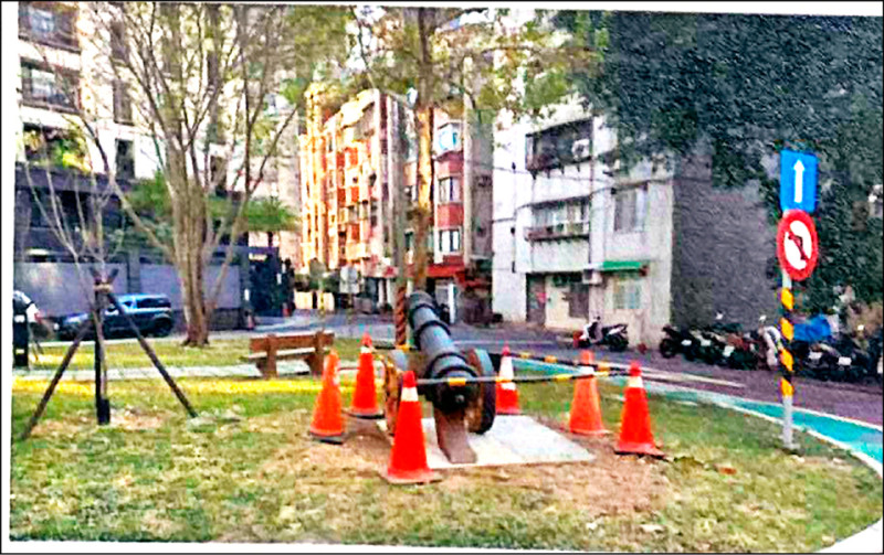 台北市天母地區添壽一號綠地近期新設一座「砲台」裝置藝術,砲口卻正對前方住宅大樓,引發民眾不安。(北市議員汪志冰提供)