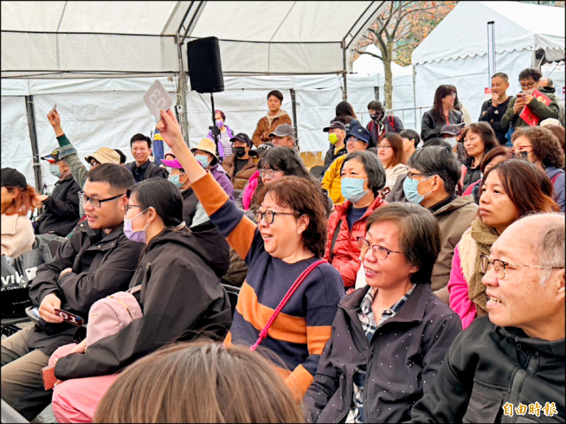 民眾參加年貨拍賣會,千元年貨通通1元起標,有民眾用不到半價就標到高價生鮮,開心帶回家圍爐加菜。(記者翁聿煌攝)