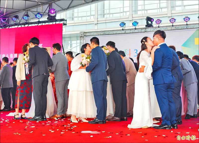 南科舉辦30週年園慶,並進行集團婚禮,新人們相互擁吻、開心合影。(記者吳俊鋒攝)