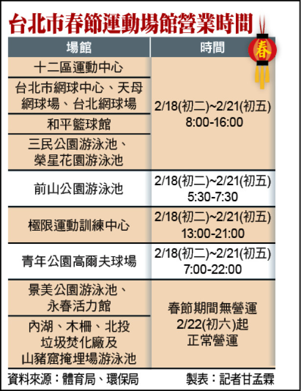 台北市體育局表示,春節期間有營運的場館的開放時間不同,十二運動中心、前山公園游泳池、台北市網球中心、台北網球場、天母網球場、三民公園游泳池、榮星花園游泳池、和平籃球館等場館,營運時間為上午八點至下午四點;前山公園游泳池初二至初五的上午五點卅分至七點卅分營業;極限運動中心初二至初五的下午一點至晚間九點營業;青年公園高爾夫球場初二至初五的上午七點至晚上十點營業。