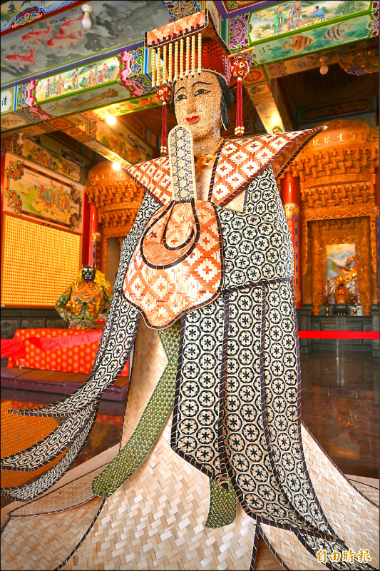 高雄彌陀朝天宮以竹篾、竹片打造一尊220公分高「竹編媽祖」,造型活潑優雅、富藝術氣息。(記者蘇福男攝)