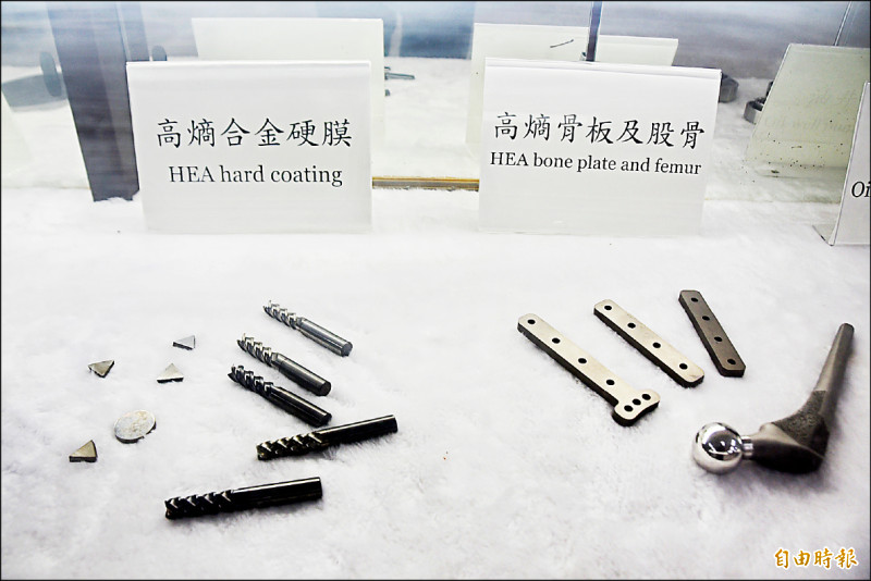 中央研究院院士葉均蔚開創「高熵合金」,並從中延伸諸多應用工具開發。,如高熵合金硬膜或高熵骨板等。(記者吳柏軒攝)