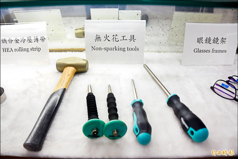 中央研究院院士葉均蔚開創「高熵合金」,並應用到如無火花工具上,能避免使用有害人體健康的「鈹」元素,製作成本也下降。(記者吳柏軒攝)