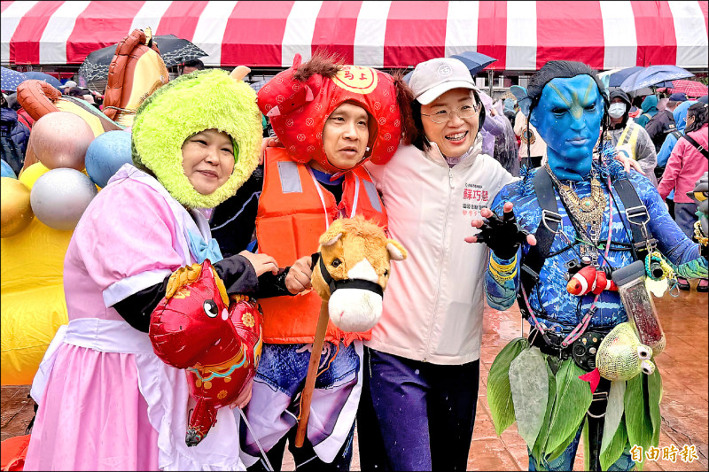 民進黨新北市長參選人、立委蘇巧慧(右二)昨出席野柳神明淨港文化祭,與跳水民眾合影。(記者俞肇福攝)