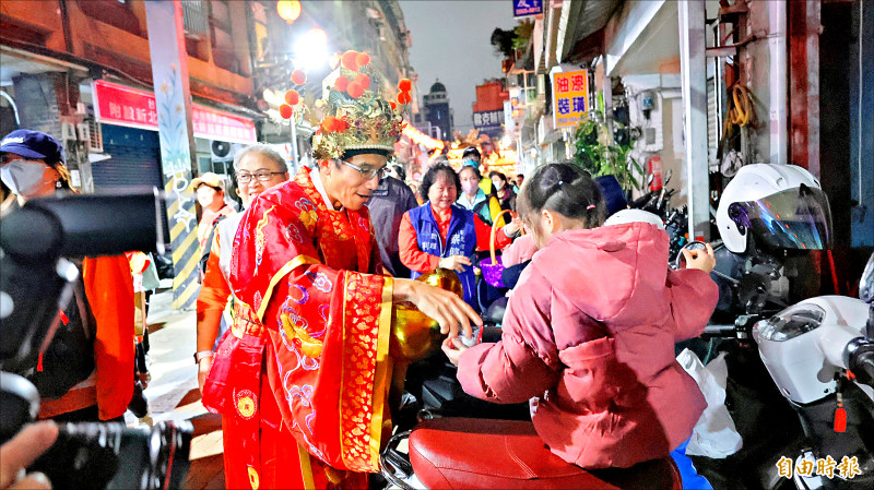 新莊區「廟街踩街慶元宵」,區長朱思戎率隊沿途發送象徵好運的糖果,向民眾獻上新春祝福。(記者黃政嘉攝)