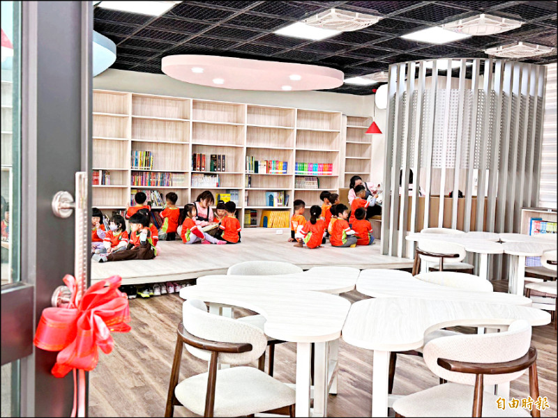 陝西國小整建後的圖書館閱讀空間明亮寬敞,學生可在館內閱讀與學習,低年級小朋友坐著就能拿到書。(記者張聰秋攝)