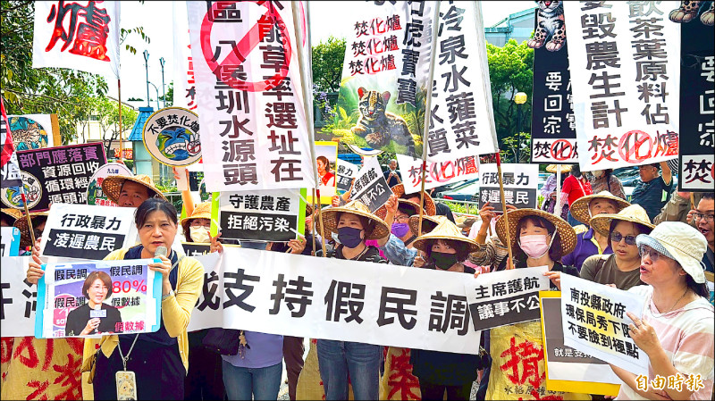 反名間焚化爐自救會和環團,會議前指南投縣長稱八成民意贊成興建焚化爐,根本是假民調。(記者陳鳳麗攝)