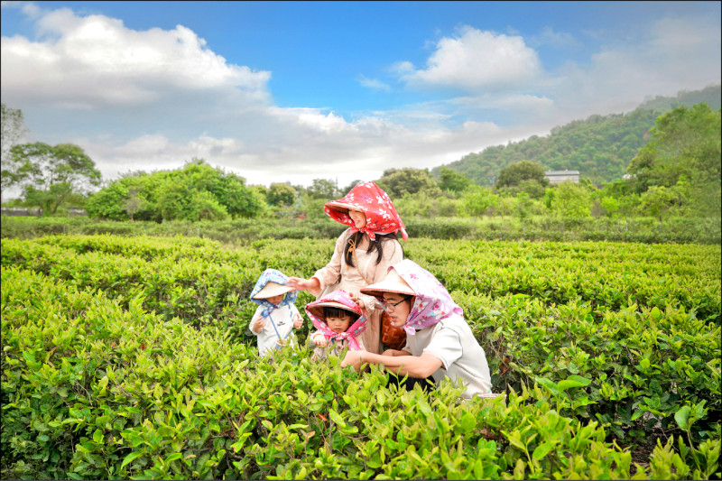 參加星源茶園的任何一項茶體驗,都會換上採茶裝備,包含斗笠、花布和竹簍。(農村水保署提供)