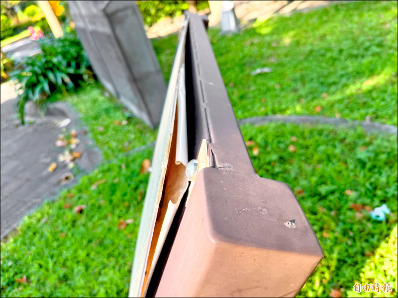 詩人作詩緬懷蔣渭水的立牌斷裂、翻起。(記者董冠怡攝)