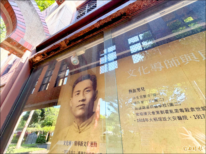記者昨天實地走訪公園,發現環境整理大致良好,但若走進導覽區,仔細一看便發現,鐵製展示櫥窗的窗框鏽蝕剝落、牌樓展示燈故障,若夜晚光線昏暗,上有馬英九題字的立牆碑文不易閱讀,電線與插頭也外露,掃把放在展示櫃旁,現場導覽電腦壞掉多年,牆上的燈飾還歪一邊,櫥窗內躺著破爛紙張,與懸掛的「文化導師與民主先驅蔣渭水」形成強烈對比,連詩人作詩緬懷蔣渭水的立牌,也任由其斷裂、翻起,民眾搖頭直呼,看不見市府對於民主價值和文化觀光的重視。