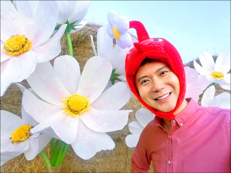 新竹縣竹北市長鄭朝方,為春日的「陌上花開」活動化身皮克敏造勢。 (擷取自鄭朝方臉書)