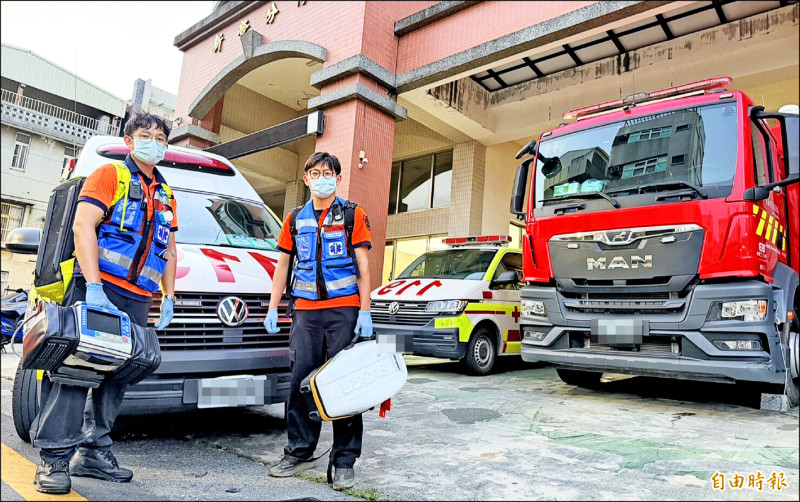 新營專責救護隊的高級救護技術員和救護車,與一般消防分隊同步出勤。(記者楊金城攝)