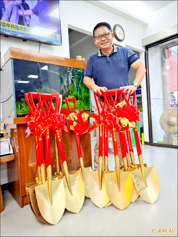 郭鴻儀說,有鄉親甚至會指定名人使用的動土金鏟,有總統賴清德簽名的金鏟詢問度最高,但賴清德擔任閣揆後,動土金鏟都由幕僚直接帶走,不容易取得,而市長任內的動土金鏟早被索取一空,堪稱台南金鏟界的人氣王。