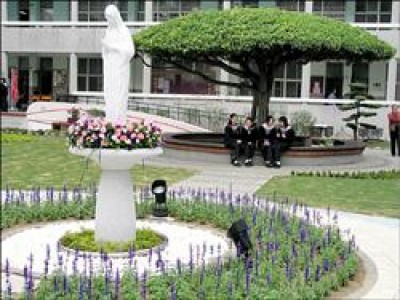南市校園再添美景!德光女中美輪美奐的聖母園昨天在天主教台南區主教林吉男撒聖水後啟用,園內草地廣闊,還有榕樹、木椅可供休憩,已成為師生最佳休憩和活動地點。