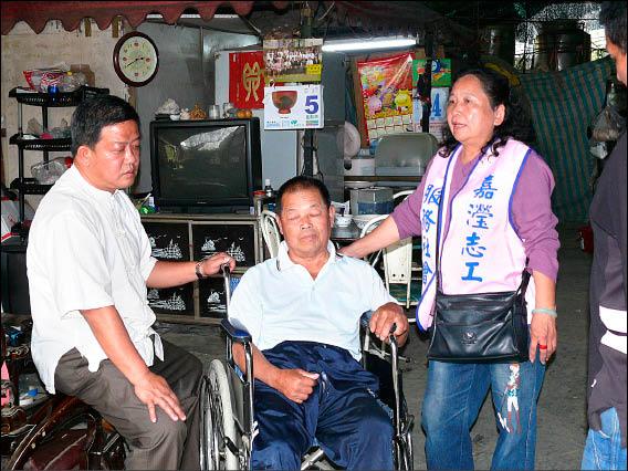 921受災戶范坤龍(中)至今無力重建,加上中風癱瘓只能坐輪椅,生計陷入困境,縣議員周義雄(左)與慈善團體前往慰問。(記者佟振國攝)