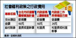「馬上關懷專案」送件之後,村里長或是村里幹事都能領取一份五十元的訪查費,而「工作所得補助方案」則能領取每份廿五元的送達費。