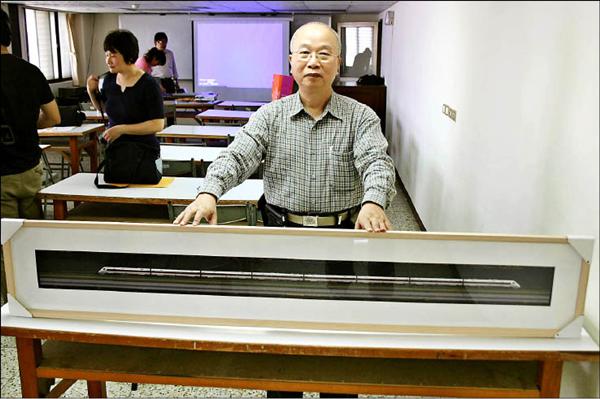 孫侾龍昨天是在東華大學創新育成中心的安排下,展示他的「線性透視定軸物移全景攝影技術」,用長達一.五公尺的幻燈片底片,記錄長形物體全貌。