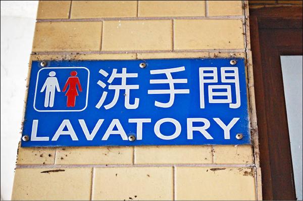 台鐵四腳亭站廁所另一個告示標卻翻為LAVATORY。(記者盧賢秀攝)