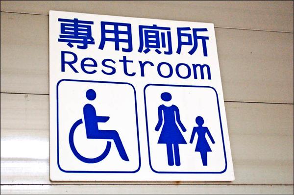 台鐵四腳亭站廁所翻譯為Restroom。(記者盧賢秀攝)