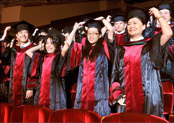 前台中市長張溫鷹(右一)昨日以牙醫系碩士班畢業生的身分參加台北醫學大學畢業典禮。(記者王敏為攝)