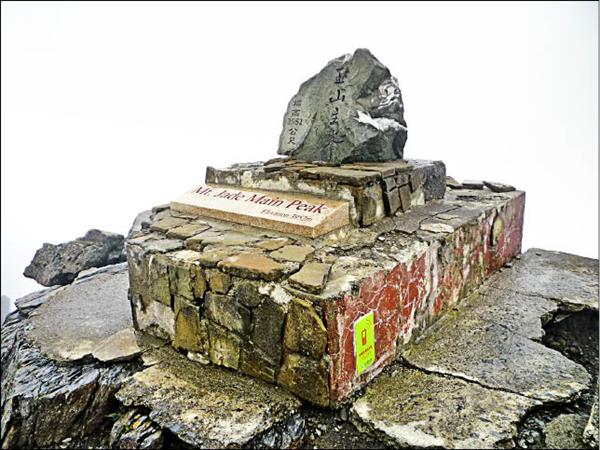 怪哉!網友PO照玉山主峰石碑基座砌石遭山友塗鴉,消息傳出,引起玉山國家公園管理處重視,十六日一早就派員上山巡視察看,結果字跡竟不見蹤影。(圖文:記者陳信仁)