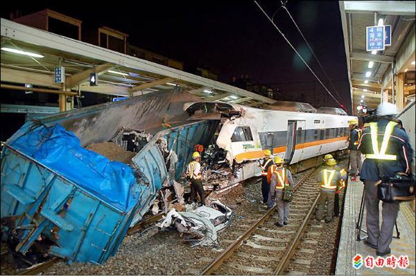 去年一月太魯閣號與闖越平交道的砂石車發生嚴重撞擊意外,車廂扭曲變形,現場一片狼藉。(資料照,記者沈繼昌攝)