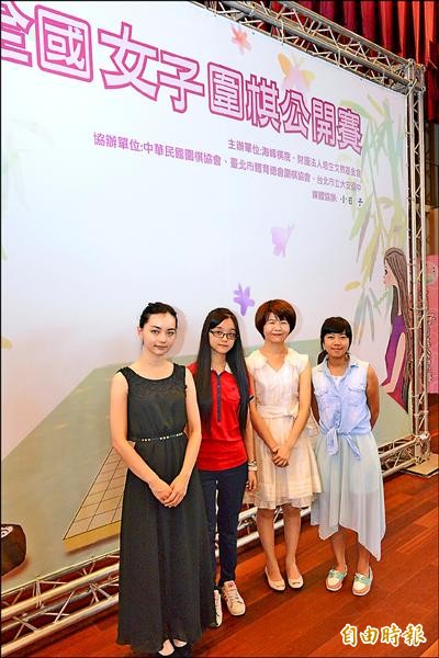第十六屆全國圍棋女子公開賽昨登場,職業女棋士黑嘉嘉(左起)、俞俐均、張正平、蕭愛霖出席為選手打氣。(記者黃立翔攝)