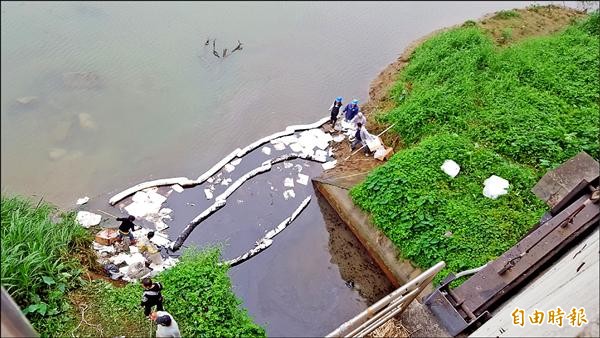 新北市環保局獲報,立刻通知關水門、設攔油索,並以吸油棉吸油污。(記者俞肇福攝)