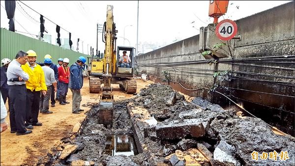 中油公司出動怪手,試圖找出破裂管線,以便更換管線。(記者俞肇福攝)
