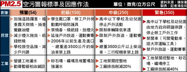 修正之後,PM2.5連續六小時達五十四微克/立方公尺時,就將發佈空污警報。廿四小時平均值達一百五十微克屬初級、兩百五十微克為中級、三百五十微克則是緊急等級。