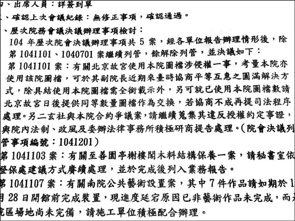 故宮博物院院務會議紀錄。(立委何欣純提供,記者蘇芳禾翻攝)