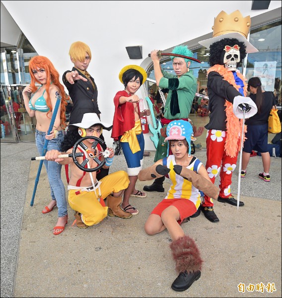 第24屆亞洲動漫創作展(PF24)昨日在花博爭艷館進行第二天展覽,現場有民眾打扮成《航海王》裡面的主角魯夫及其同伴。(記者黃耀徵攝)