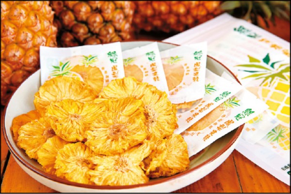 「有鮮鳳梨脆果片」是以太空包的做法,將鳳梨切塊後冰凍,再將水分抽乾,吃來爽脆又帶鳳梨的風味。(記者潘自強/攝影)