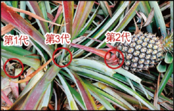 「3代同堂」的老欉鳳梨,左邊已採收過遺留的芽株為第1代,最右側成熟中的鳳梨為第2代,而中間的芽株為未來的第3代鳳梨。(記者許麗娟/攝影)