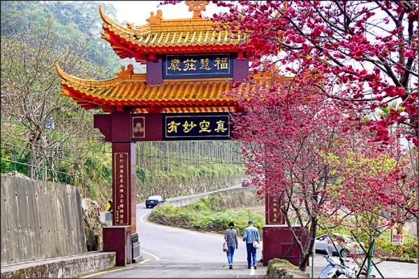 彌陀禪寺牌樓旁的緋寒櫻,開花時期遊客如織。(圖片提供/瑪格)