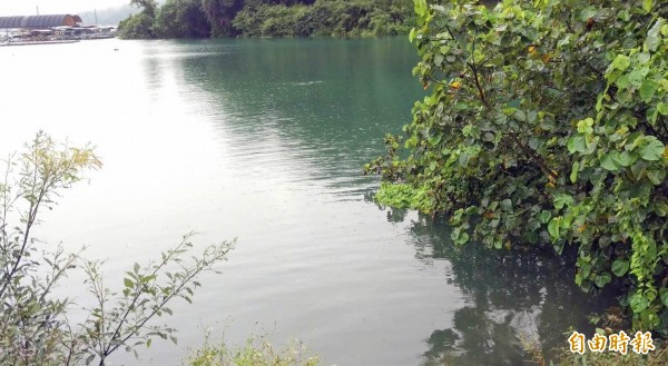日月潭南邊湖水質清澈度與山溝距離遠近呈正比關係,圖右邊水域較左邊顯得相當混濁。(記者謝介裕攝)
