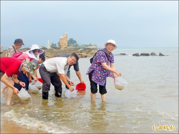 澎湖縣農漁局官員至金門考察養殖業務,也一起參加這項有意義的保育活動;幾名在地的高齡遊客,生平第一次「嚐鮮」,把放流視為做功德,不時唸著「阿彌陀佛」,一連拿桶子放流好幾次,認為「有意義又好玩」。