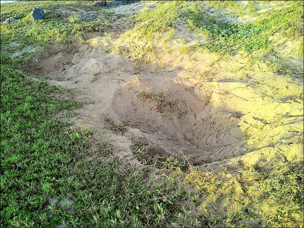 綠蠵龜在沙灘上方草地區,挖下卵窩孕育新生命。(許瑞琪提供)