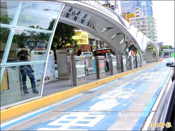 台灣大道的公車專用道多處破損 ,但市府卻遲遲未修復,引發民怨。(記者蘇金鳳攝)