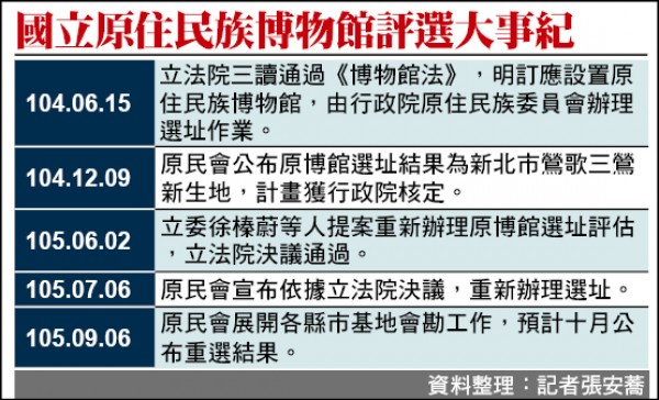 行政院原本核定「國立原住民族博物館」坐落在鶯歌區,未料卻因其他縣市持續爭取,翻案重新評選,市府及多位民代不分藍綠昨天砲口一致,怒轟原民會創下行政惡例,新北市猶如「金牌都拿了,藥檢也過關,卻要重比一次!」質疑重選違背原住民族正義的精神。