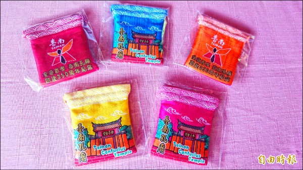 孔廟文化基金會製作五種顏色的智慧鹽袋,將送給參加祭孔活動的民眾。(記者劉婉君攝)