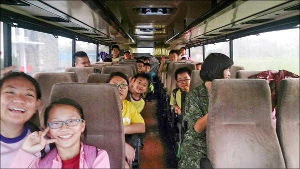 中颱梅姬襲台,高雄市放假半天,昨天中午過後風雨增強,瞬間颳起十一級強風,由於陸軍官校校區廣大,秉持「軍民一家」精神,出動一部軍用大客車,接送鄰近誠正國小學生放學,方便學生安全返家,降低家長外出接送的危險性。