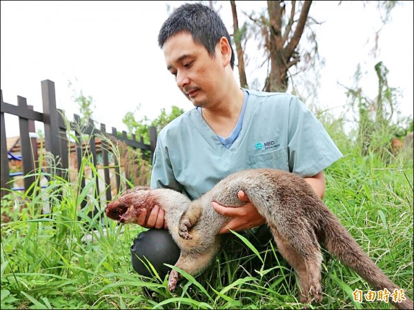 金門野生動物救援暨保育協會理事長歐陽夢澍,不捨地檢視死亡水獺是否有外傷。(記者吳正庭攝)