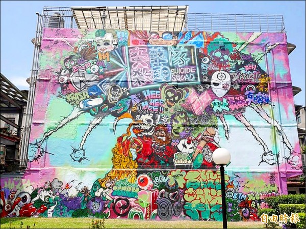 傅星翰為華納打造台灣風格的「自殺突擊隊」牆面創作。(記者何世昌攝)