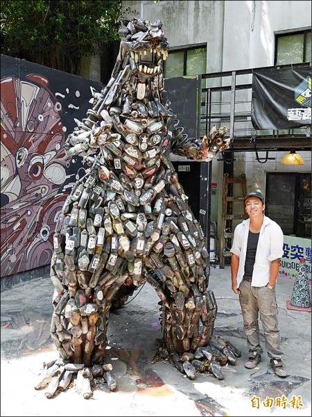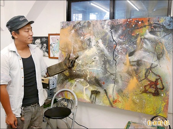 傅星翰和他的創作「噴罐哥吉拉」,令人驚豔。(記者何世昌攝)