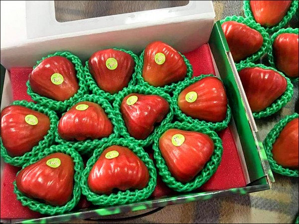 這盒來自佳冬的蓮霧,昨天在台北拍賣出一公斤千元天價。(記者陳彥廷翻攝)